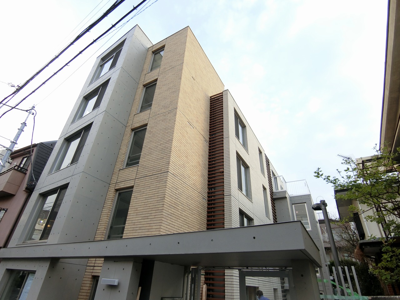 道路面に回ると、コンクリートとタイルで仕上げた緑道側とは異なる表情。